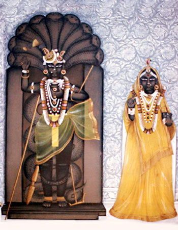 Revati, the wife of Balaram, is also installed in this temple. She is to the left of the front altar door with Her back to the wall facing Balaram. She cannot be seen from the front door of the altar, but She can be viewed from the right side door...